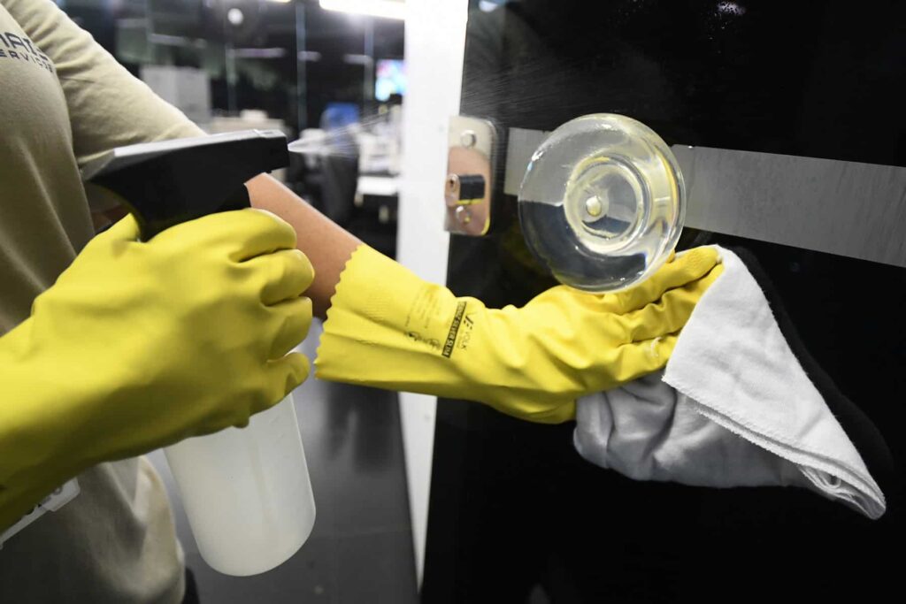 Procure sempre higienizar os locais de maior contato com o cliente com álcool 70% e, quando possível, passe sabão, detergente ou água sanitária. Também aumente a frequência da limpeza de áreas comuns, como refeitórios e banheiros.